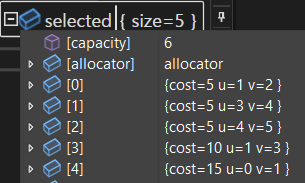 중지점을 걸어 확인하면 아래와 같이 최종 코스트와 Kruskal 알고리즘에 따라 선택된 간선을 확인할 수 있다.