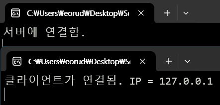 서버에 정상적으로 연결되었다면 서버 쪽과 클라이언트 쪽 콘솔에 정상적으로 로그가 떠야한다.