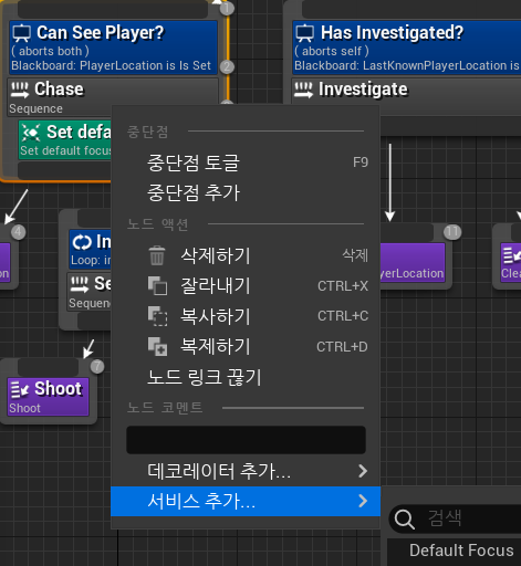 이제 서비스 노드가 도입되었으므로 ShooterAIController에서 플레이어 폰을 찾아 이동하는 코드를 서비스로 대체할 수 있게 되었다.