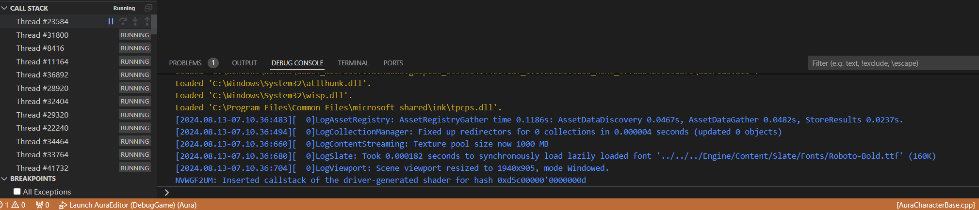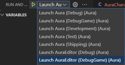 왼쪽 창에서 디버그 아이콘 클릭 -> 드롭다운 메뉴를 클릭해 Launch AuraEditor (DebugGame) 선택 후 좌측의 재생 버튼을 클릭한다.
