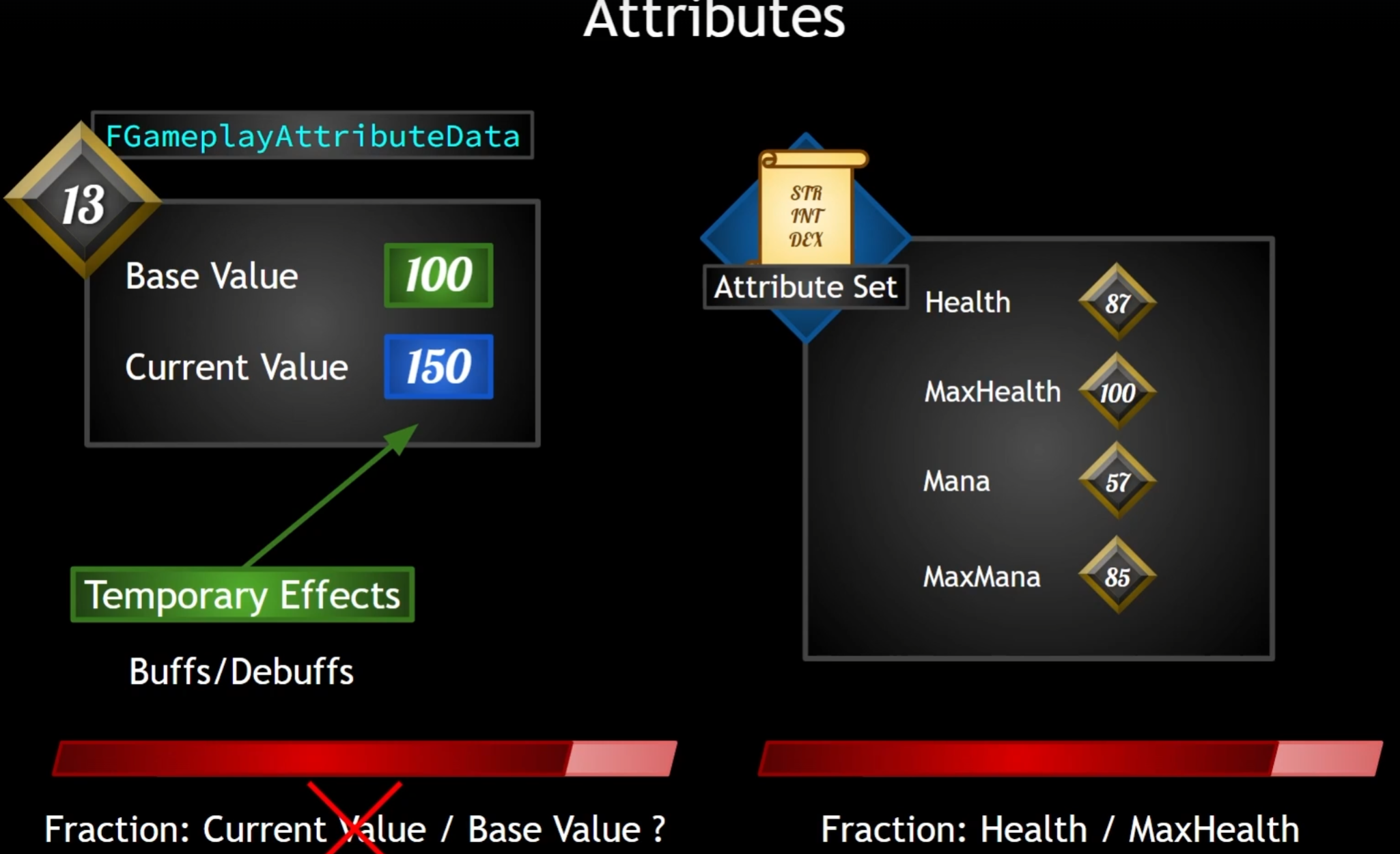 - 현재 값(Current Value) : 임시적인 게임플레이 이펙트(버프, 디버프)로 인한 속성의 현재 값