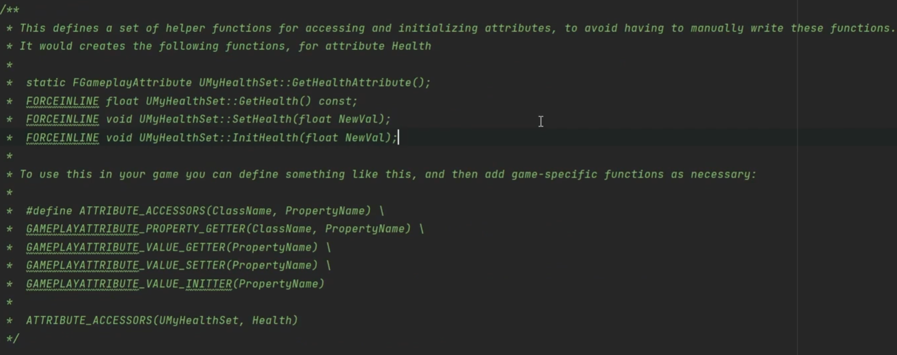 GAMEPLAYATTRIBUTE_PROPERTY_GETTER 매크로를 이용하여 GetHealth 함수, SetHealth 함수, InitHealth 함수를 생성한다.