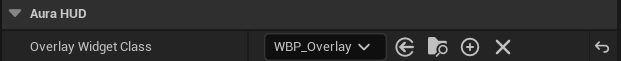 AuraHUD를 상속받는 블루 프린트 BP_AuraHUD를 생성하고 이전에 TSubClassOf로 지정했던 Overlay Widget Class를 이전에 생성했던 오버레이 블루프린트로 지정한다.