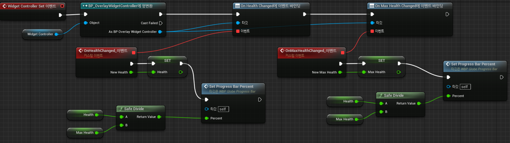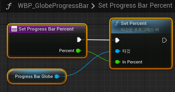 새로운 체력과 새로운 최대 체력에는 Safe Divide를 이용해 최대 체력이 0이 되어도 오류가 발생하지 않도록 하고, 방금 생성했던 Set Progress Bar Percent 블루프린트 함수를 통해 Globe의 Progress bar 퍼센트를 조정하도록 한다.