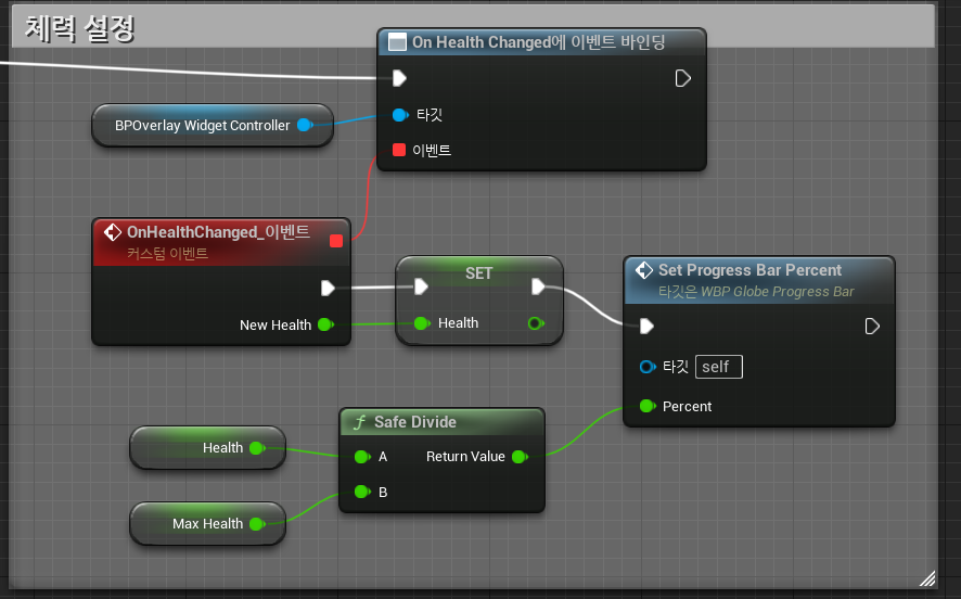 이어서 위젯 블루프린트에서 OnHealthChanged와 바인딩된 함수가 발동하며 체력 글로브 퍼센트가 변화한다.