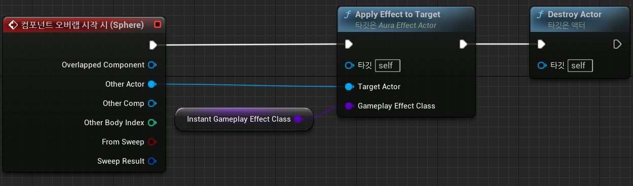 체력 포션의 블루프린트에 스태틱 메시와 스피어가 생성된 이후, 이벤트 그래프를 아래와 같이 작성한다.