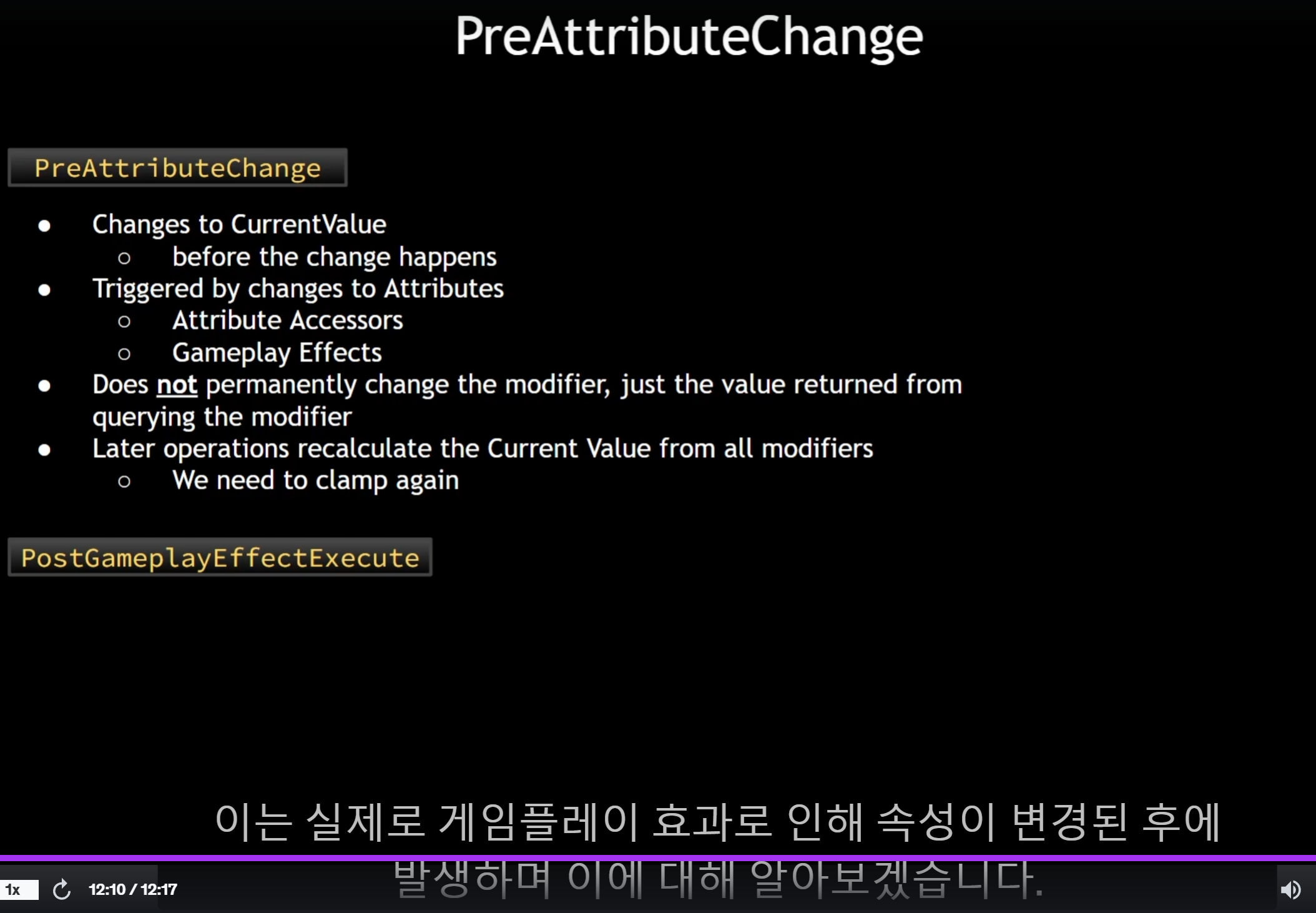 PreAttributeChange -> 속성 변경 -> PostGameplayEffectExecute