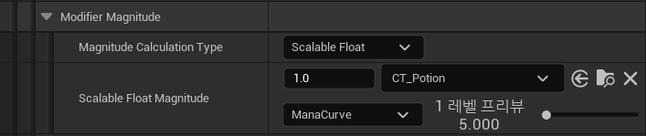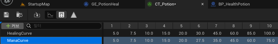 커브를 추가해서 마나 커브를 생성하고 마나 포션(GE_PotionMana)에 이를 적용해준다.