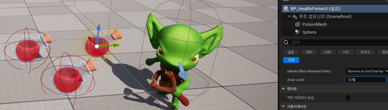 새로운 물약을 배치한 후 디테일 창에서 Actor Level 값을 변경해준다.