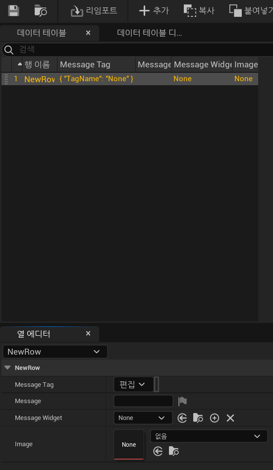 오버레이 위젯 컨트롤러의 블루프린트에서 메시지 위젯 데이터 테이블을 가져다 쓸 수 있도록 설정한다.