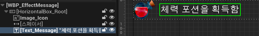 이펙트 메세지 위젯 블루프린터의 루트를 오버레이로 래핑한다.
