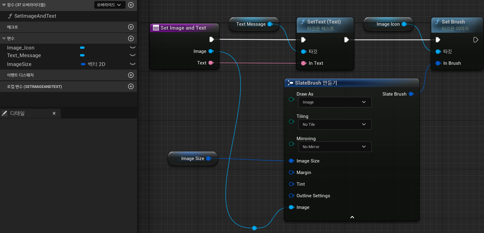 간단하게 하기 위해 함수를 생성하고 입력 핀을 Texture2D 타입의 Image, 텍스트 타입의 Text 두 개를 추가하고 아래와 같이 배치한다.