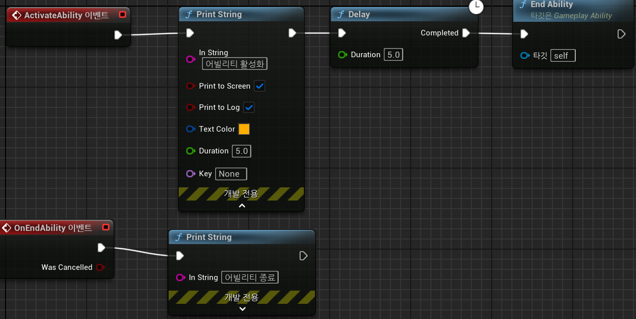 GameplayAbility는 ActivateAbility 이벤트 노드와 OnEndAbility 이벤트 노드를 사용한다.