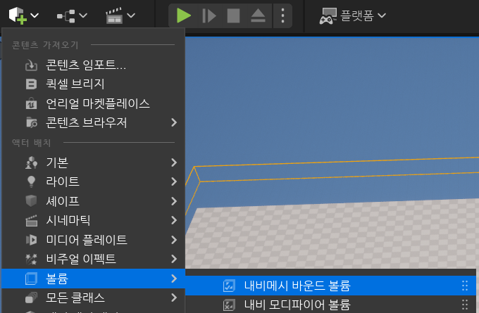 길 찾기를 수행하려면 맵 상에 내비 메시 바운드 볼륨을 추가해야 한다.
