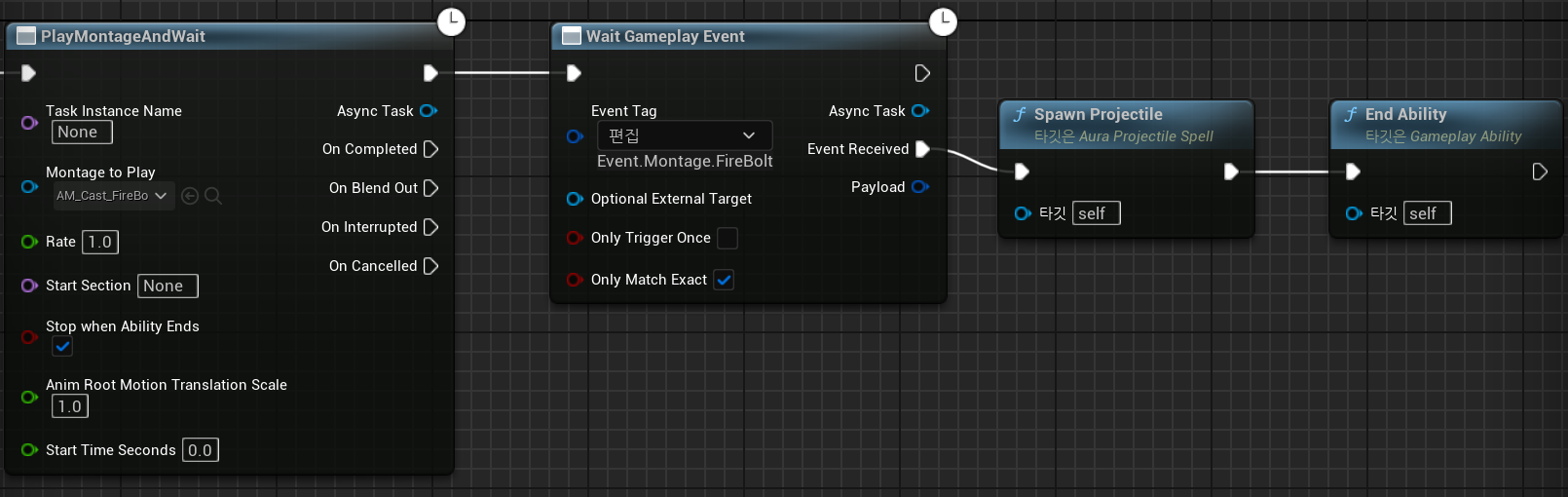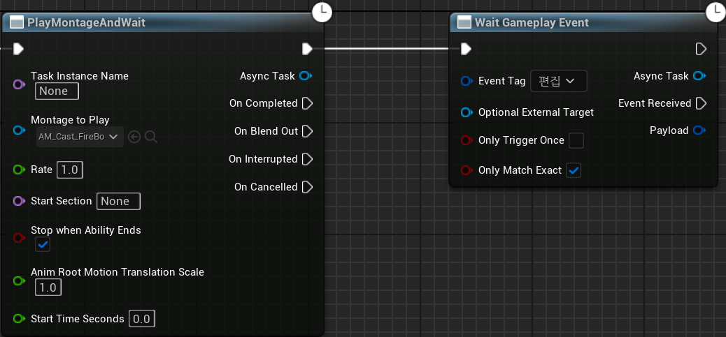 Wait Gameplay Event에 해당 스펠과 맞는 태그를 매칭시켜주고 테스트한다.