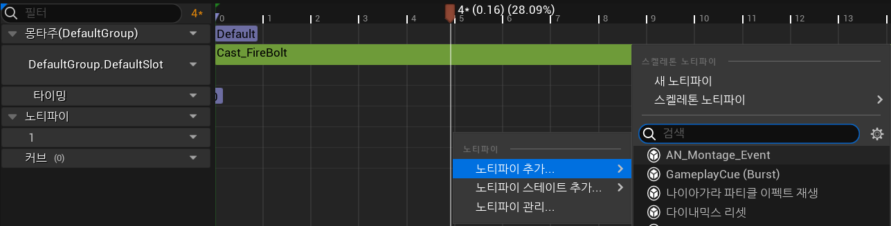 노티파이를 추가하고 싶은 타임라인 위치에 우클릭 - 노티파이 추가 - AN_Montage_Event를 지정한다.