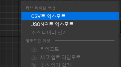 커브 테이블을 우클릭하여 CSV로 익스포트를 눌러 프로젝트 내에 CSV 파일로 내보내기 할 수 있다.