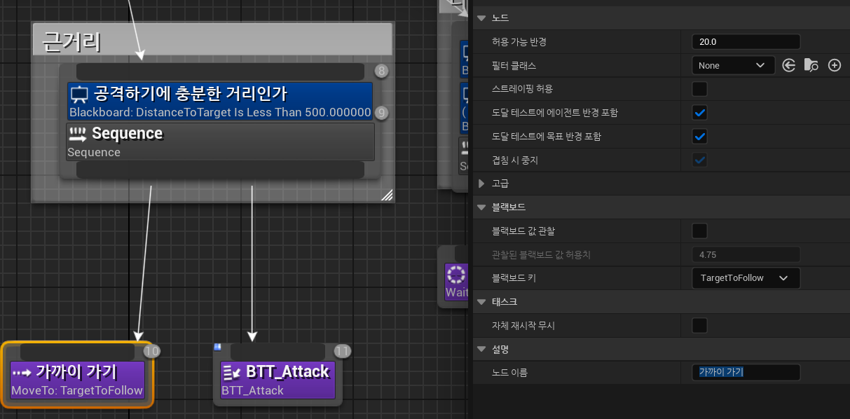 BTT_Attack 노드는 시퀀스 노드 아래에 위치하므로 실패할 때까지 계속 작동한다.