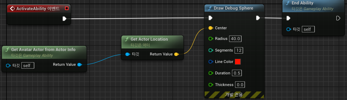 어빌리티가 활성화되면 아바타 액터의 위치를 가져와 디버그 구체를 그린다.