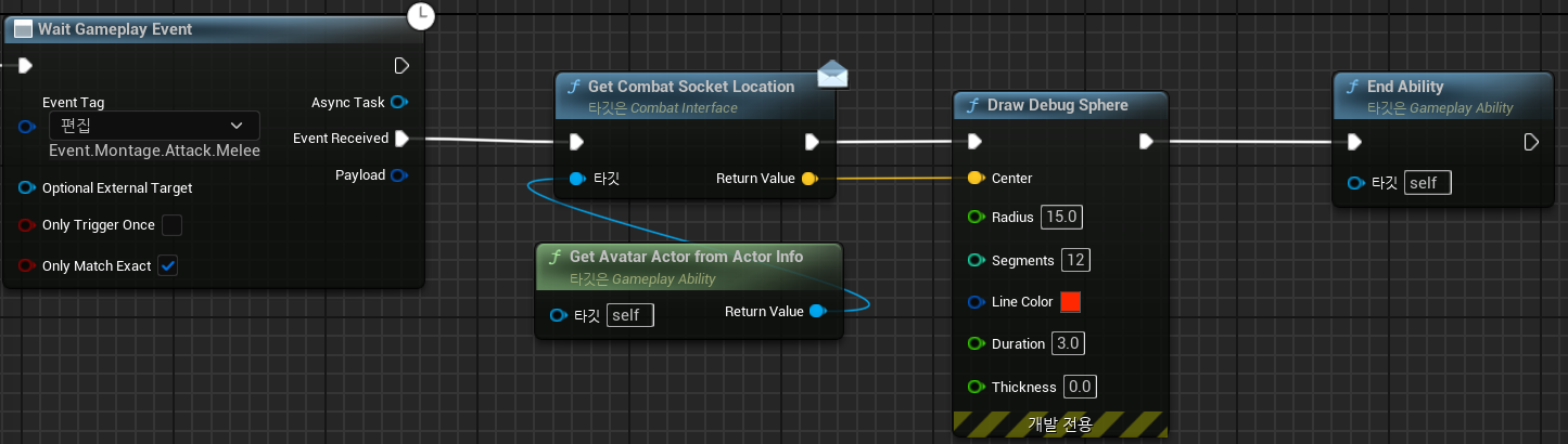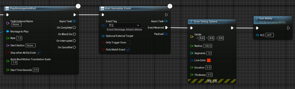 Wait Gameplay Event 노드를 사용해 Attack.Melee 태그를 가진 노티파이가 이벤트를 호출하기까지 대기한다.