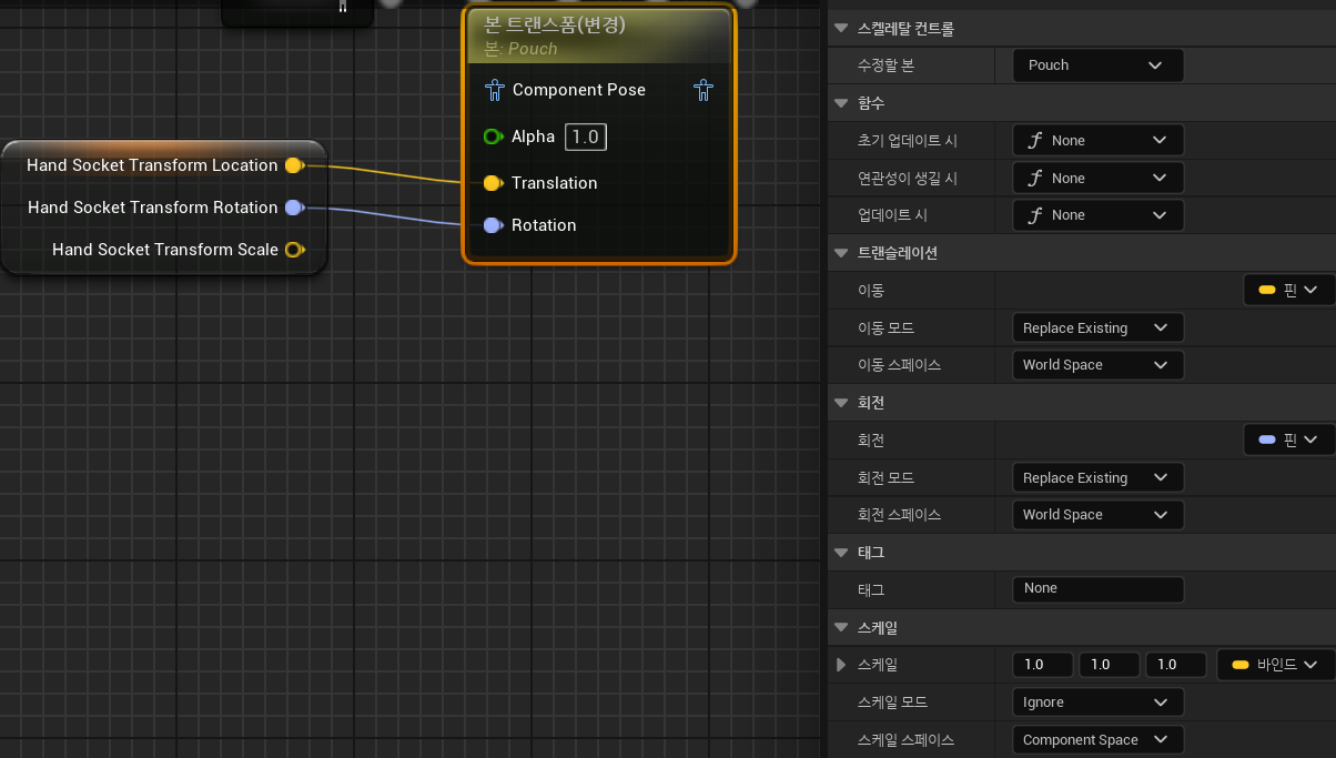 본 트랜스폼 노드를 사용하여 오른손 소켓에 대한 이동과 회전을 가져올 것이다.