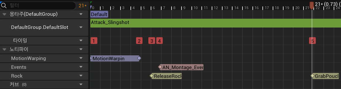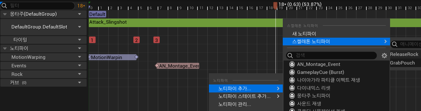 기본적으로 에셋에 있는 스켈레톤 노티파이 두 개를 이용하여 돌을 놓는 지점과 다시 파우치를 잡는 지점에 노티파이를 생성한다.