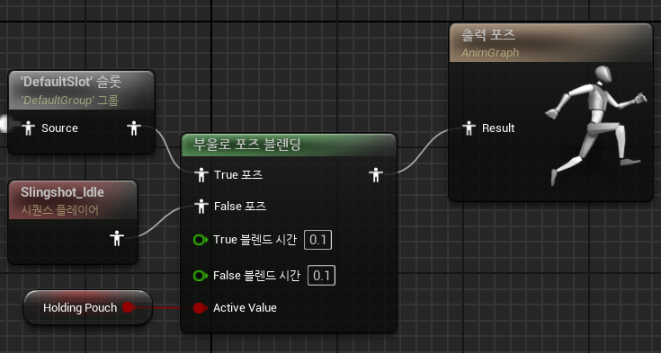 부울로 포즈 블렌딩을 사용하여 고블린이 파우치를 잡고 있지 않을 때는 새총이 Idle 애니메이션 상태로 있을 것이다.