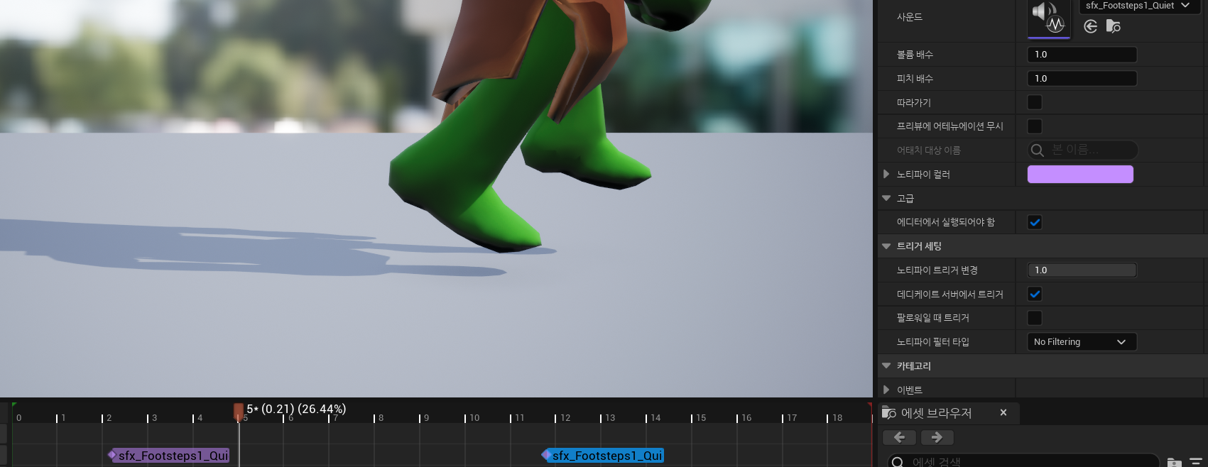 창 고블린의 발이 땅에 닿는 순간에 사운드 노티파이를 이용하여 발소리를 출력한다.