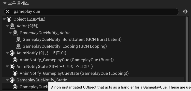 GameplayCueNotify_Static을 상속받는 블루프린트를 생성한다.