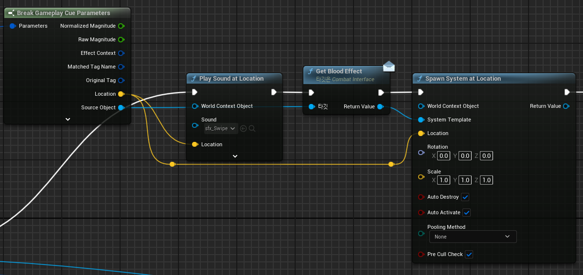 임시적으로 사운드와 이펙트를 지정하고 Location을 가져와 연결한다.