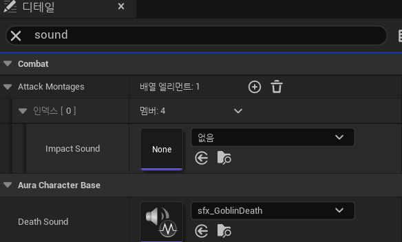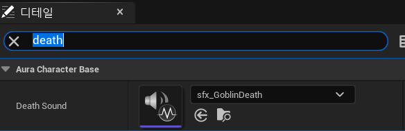 이전에 AuraCharacterBase에서 혈흔 효과를 포인터로 저장하고 있던 것과 마찬가지로 소리를 저장하여 죽음 판정에 사운드를 출력하게 한다.