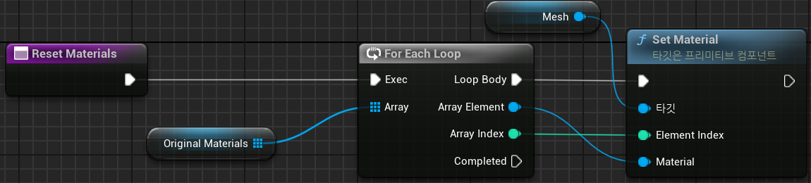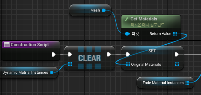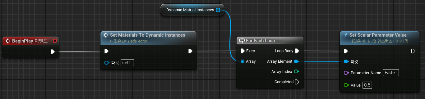 Fade 버전의 머티리얼들을 순회해 다이내믹 머티리얼 인스턴스로 생성하고 배열로 저장한다.