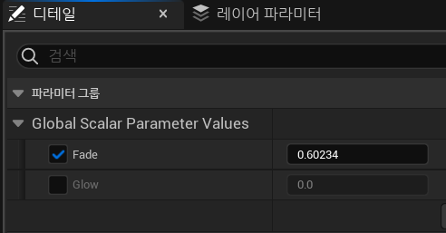 위에서 변환한 파라미터의 값을 블루프린트에서 조절할 수 있게 되었다.