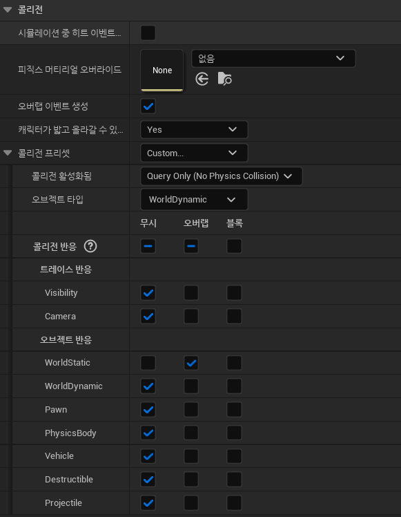 가려지는 액터는 대부분 배경이므로 오브젝트 타입을 WorldStatic으로 지정하고 박스에서도 WorldStatic에 대해서만 오버랩을 감지할 것이다.
