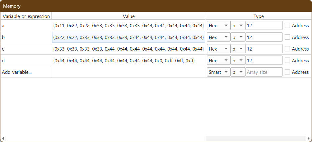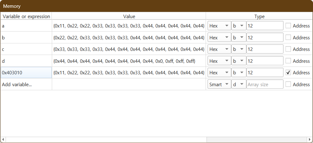 변수 'b'의 메모리 주소는 'a'의 주소에 1바이트를 더하면 됨 -> 0x403011