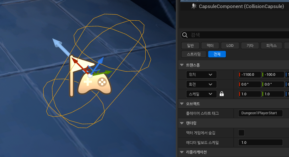 이제 하드코딩된 플레이어 스타트 지점이 아닌, 게임 인스턴스에서 받아온 플레이어 스타트 태그를 이용해 해당 플레이어 스타트를 가져온다.