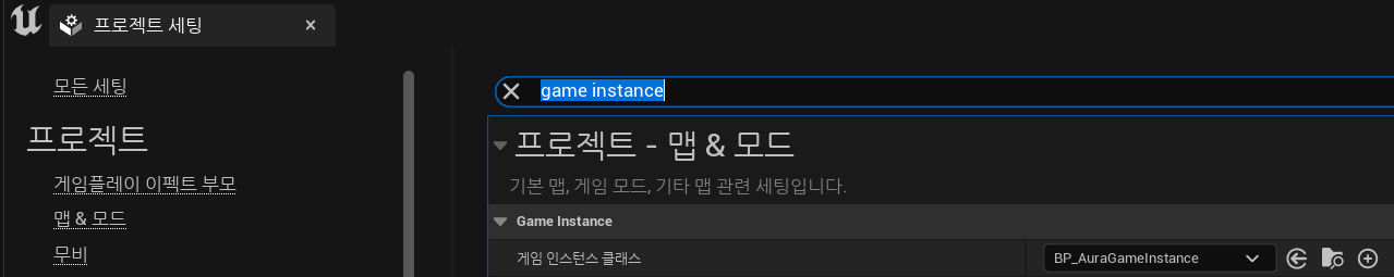 (6-2) 프로젝트 세팅에서 게임 인스턴스를 BP_AuraGameInstance로 지정