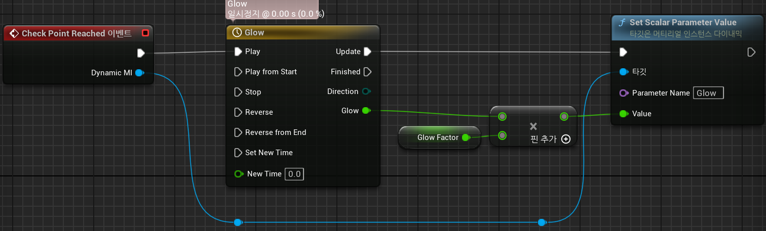 해당 액터와 플레이어 캐릭터가 닿으면 타임라인에 따라 값이 변화하고, 해당 값에 따라 동적 머티리얼 인스턴스의 파라미터가 변화하도록 지정한다.