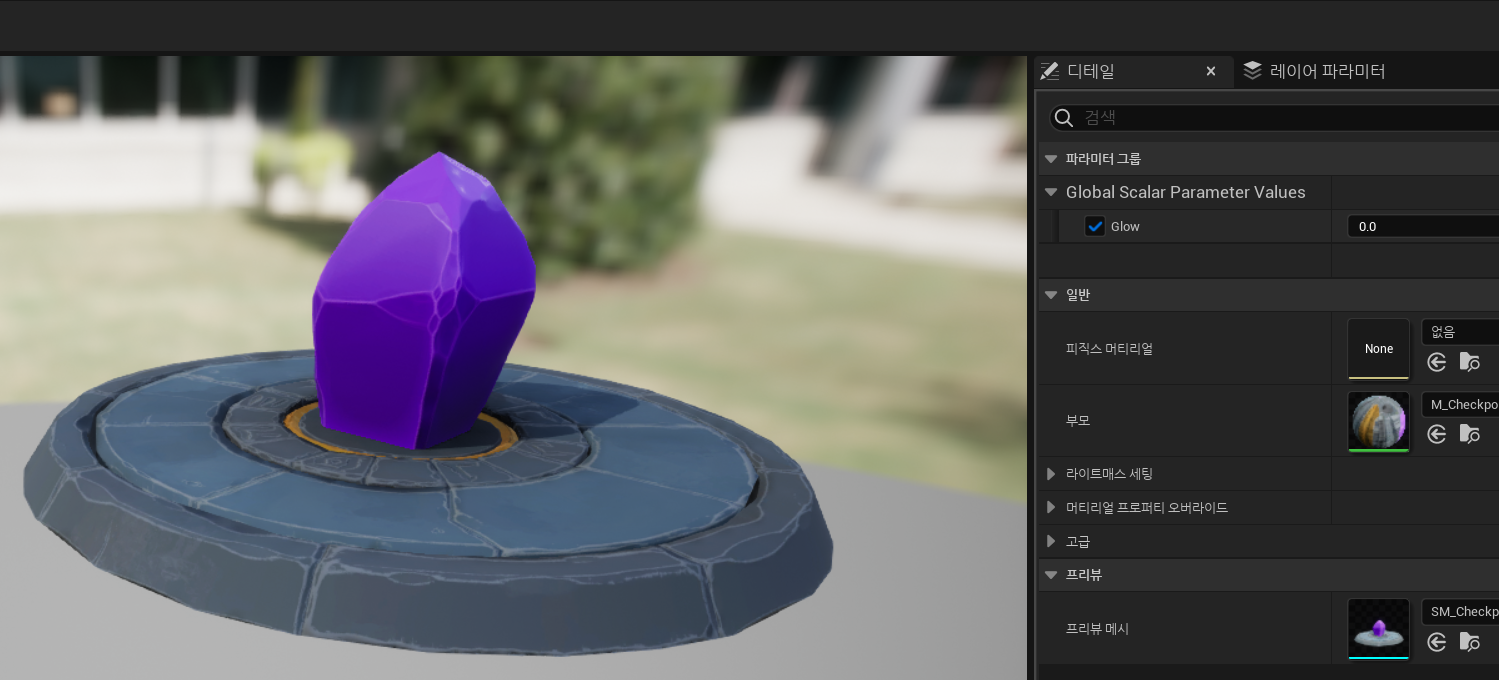 한편, 체크포인트의 머티리얼 인스턴스를 살펴보면 Glow 매개 변수가 있어 이를 조정할 수 있게 되어있다.