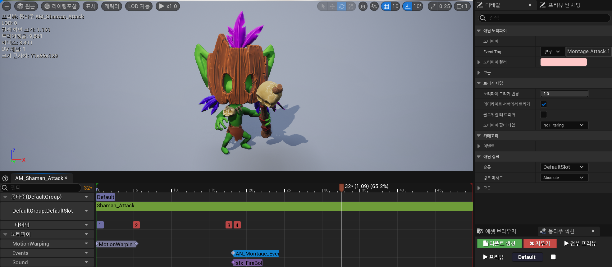 애님 노티파이가 Montage.Attack.1로 지정되어 있음을 볼 수 있다.