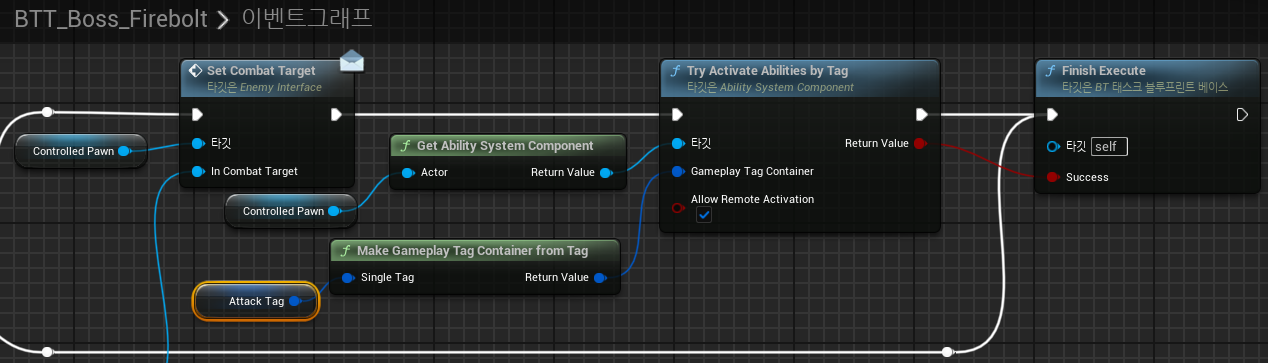 미니언의 갯수가 적절하면 Ability Tag를 Attack 태그(Abilities.Attack)으로 설정하여, 파이어볼트 공격을 하는 데, 이는 엘리멘탈리스트 직업군 캐릭터인 샤먼 몬스터의 몽타주에서 해당 태그를 전달하고 있기 때문이다.