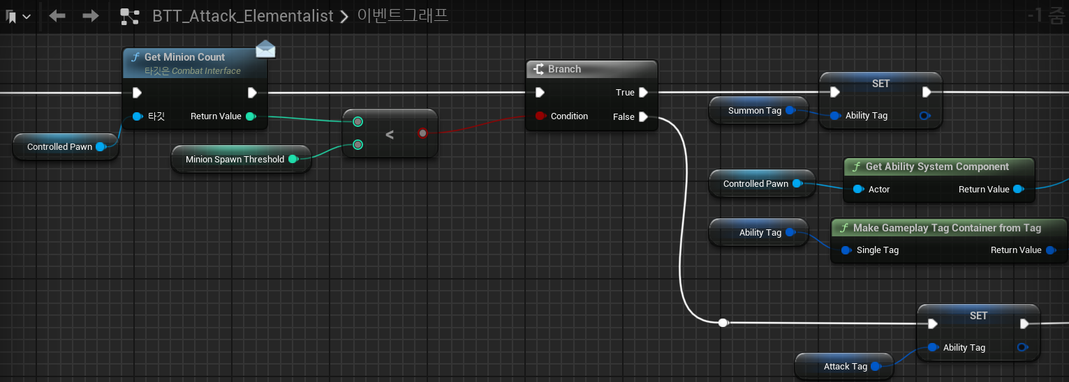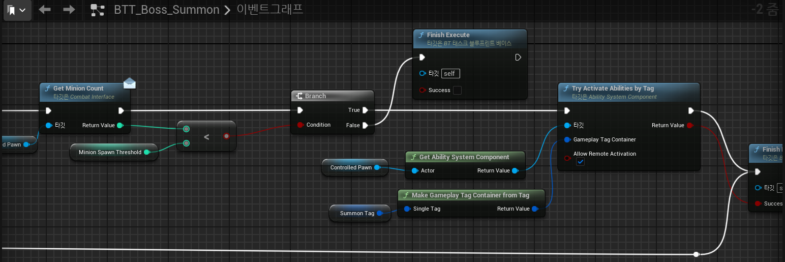 공격 태스크를 살펴보면, 기본적으로 소환한 미니언의 갯수를 체크하여 Minion Spawn Threshold의 갯수보다 미니언의 갯수가 적으면 Summon Tag를 이용하여 GA_Summon 어빌리티를 실행한다.